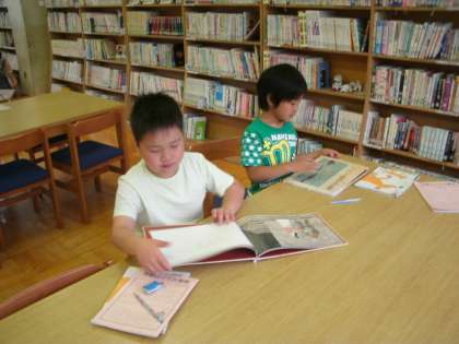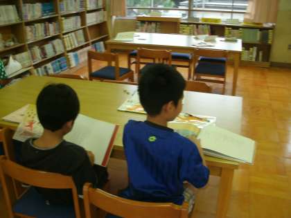 図書室で日本の昔話を読みました。図書館支援員の佐々木先生に図書室にある日本の昔話の本を集めていただきました。50冊近くの本がありました。「いなばの白うさぎ」の主人公オオクニヌシが出てくる話などもあり,子どもたちは興味深げに本を読んでいました。