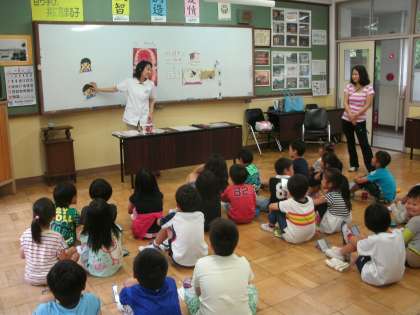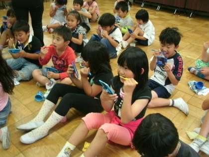 歯科衛生士の先生に来ていただいて,歯みがきの仕方を教えていただきました。食べかすと虫歯菌が合わさって歯垢ができること,歯垢が虫歯の原因になることを教えていただきました。歯を磨くときは歯ブラシを鉛筆のように持って優しく磨くことを練習しました。