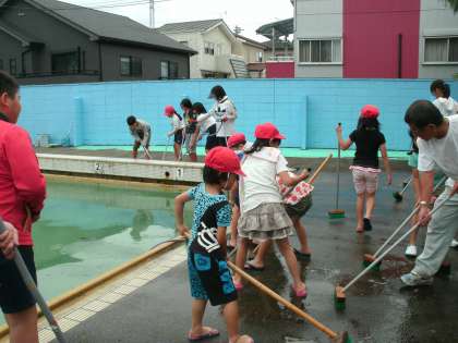 今日のチャレンジ活動はなかよしグループ1,2,3班。プールサイドを磨きました。1年生も頑張っていました。