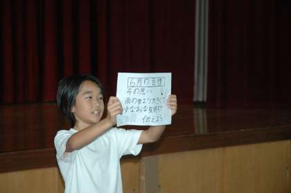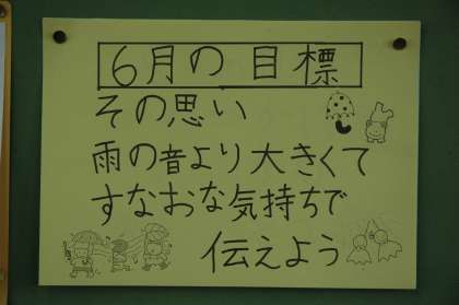 児童朝会で6月の児童会目標が発表されました。「その思い,雨の音より大きくて,素直な気持ちで伝えよう」です。
