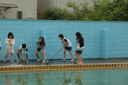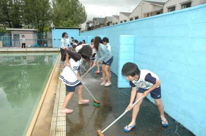 チャレンジ活動のプールサイドの掃除がありました。この日のグループも一生懸命デッキブラシを動かして掃除をしていました。6年生のリーダーも初めから最後まで意欲的に動いていました。