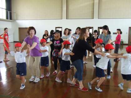 今日は,1年生とお家の方がいっしょにふれあってゲームを楽しむふれあい集会がありました。はじめにしたのは「かもつれっしゃ」
