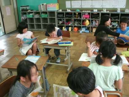 国語科の学習で「ともこさんはどこかな」という教材に取り組んでいます。遊園地で迷子になった子の特徴を伝えて,教科書のイラストからその子を探します。今日は友達同士で迷子さがしゲームをしました。