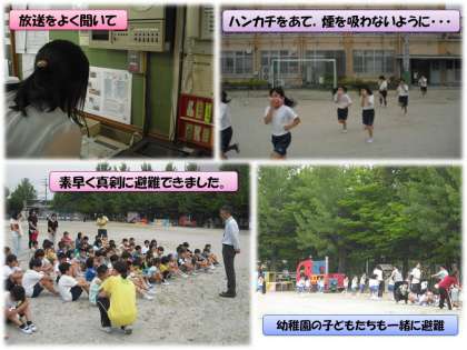 理科室で火災が起こったという想定で,向島幼稚園の子どもたちとも一緒に避難訓練を行いました。