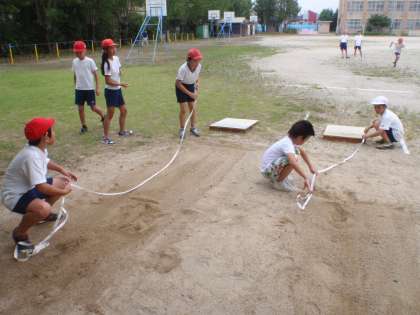体育の時間の走り幅跳びは,跳んだ距離を自分達で測ります。チームで協力して,迅速に行動しています。