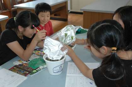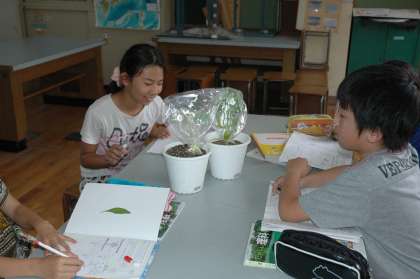 朝に仕掛けた実験用のホウセンカを見ました。ビニル袋を被せておくと水滴がたまっていました。一方,葉を取り除いた方は水滴がありません。実験は見事に成功しました。