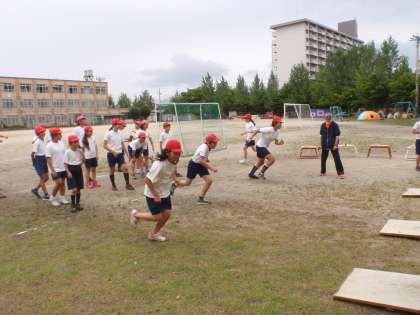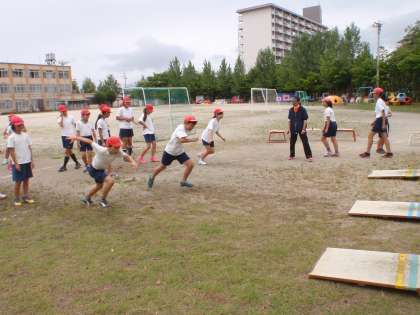 準備をして,活動を始めてしばらくすると,小さな雨粒を感じました。元気に活動を続けましたが,雨粒が大きくなり体育の学習を切り上げました。この続きは次の体育の時間に行います。
