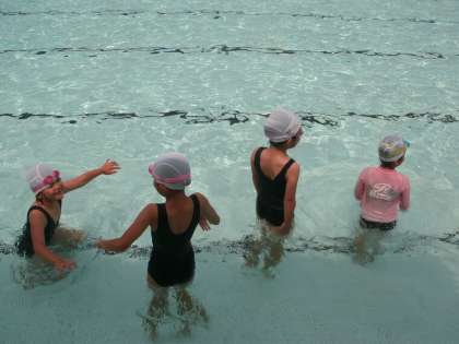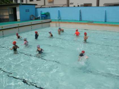 今日の水あそびでは,水に親しむためにお互いに水を掛け合ったり,プールの底に沈んだボールやコインを顔をつけて拾ったりしました。少し水は冷たかったですが,楽しい時間を過ごすことができました。