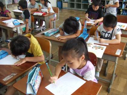 国語「たからものをおしえよう」では,自分のたからものについて友達に教えます。今日は宝物の絵を描いて,何を話すか考えました。
