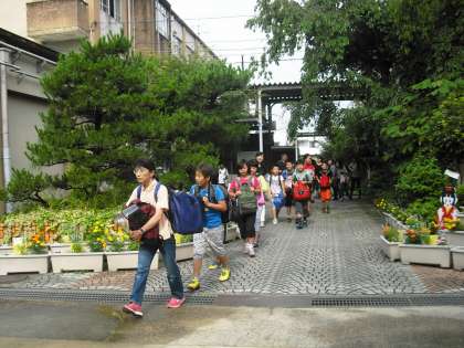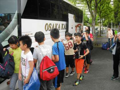 出発式を終え,向島二の丸小学校の5年生と一緒に,大型バスで若狭湾へ向かいました。