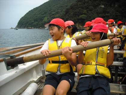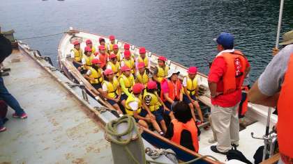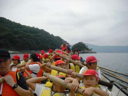 艇長の掛け声に合わせて「ソーレ」と元気よく声をだし,力強く漕ぎました。