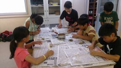 海の学習室で,貝殻ろうそくづくりをしています。