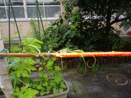 ツルレイシの茎が1日にどれだけ伸びるかを,金太ロードで調べています。