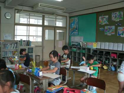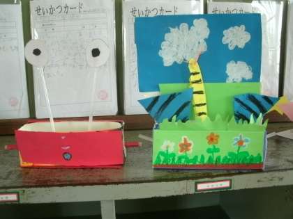 図画工作科で,牛乳パックとストローを使ったクルピョコストローに取り組みました。動くおもちゃを作りました。画用紙やクレパスを使って楽しい作品になりました。