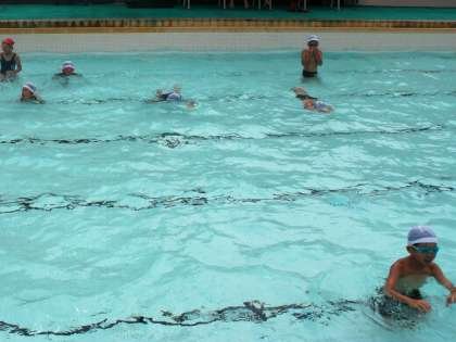風は強かったですが,水温は高かったので,たっぷりつかりながら学習を進めました。大の字うきなどをした後,けのびを練習しました。しっかり伸びて,プールの横の端から横の端までの12mを二回足をつくだけで泳げた子もいました。