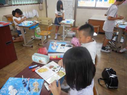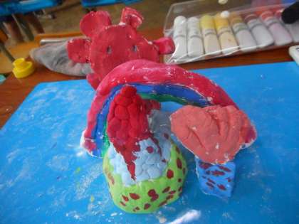紙粘土の作品に色をつけていきました。