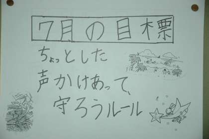 「ちょっとした,声かけあって,守ろうルール」が,7月の目標です。一人一人がルールを守ることは大切ですが,声をかけ合うことも大切なことだと確認しました。
