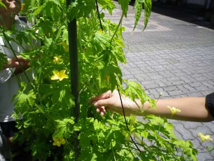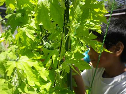 ツルレイシの成長の様子を観察しました。いくつか実ができています。