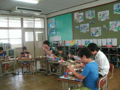 夏休み前の最後の給食は,クラスみんなで輪になって食べました。ボランティアの先生もいっしょに食べてくださって,楽しい時間を過ごしました。
