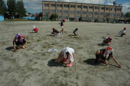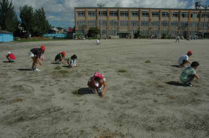 運動場に生えている草を抜きました。6年生も割り当ての範囲を黙々と作業をしました。