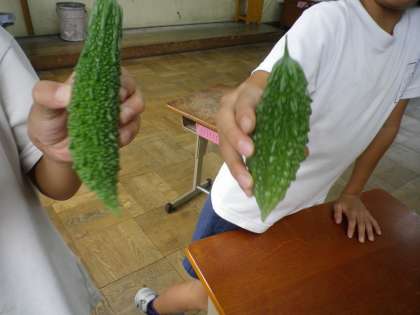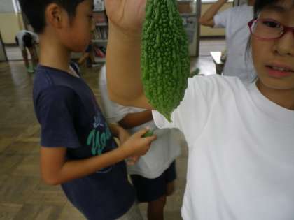 毎日ツルレイシのトンネルを通り,ツルレイシの成長を見ています。今日も収穫ができました。