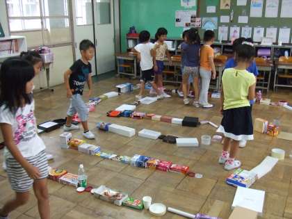 図工の学習でたくさんの箱をならべて迷路を作りました。途中で出会った人と「あっち向いてほい!」をして楽しんでいます。