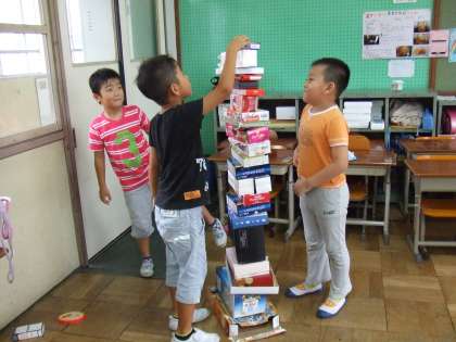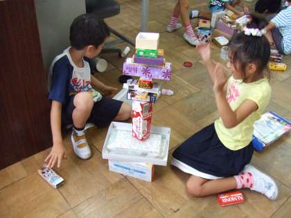 ぐらぐらゆらゆら。高く積むのは難しい。でも身長を超えるほど積めました。