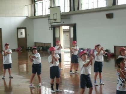 夏休み明け初めての1・2は体育館で,ダンスの練習とドンじゃんけんをしました。暑かったですが元気いっぱいに遊ぶことができました。