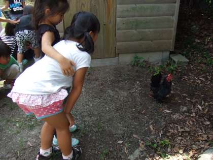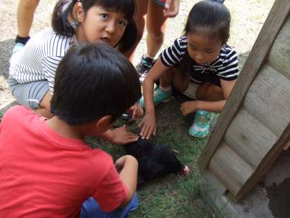 生活科の「いきものとなかよし」の学習で、学校のちゃぼに会いに行きました。二の北のちゃぼはとてもおとなしく,かしこいので,みんな「かわいい、かわいい」と嬉しそうに観察したり,触れたりしました。