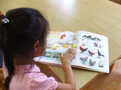 ちゃぼのことをしらべるために,図書室へ行って図鑑や本を探しました。
