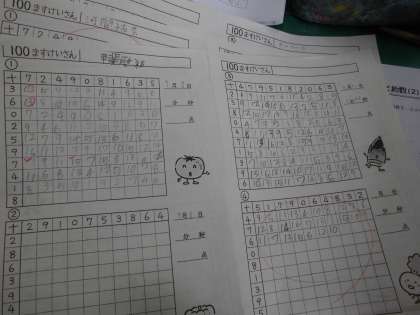 100マスのたし算を再開しました。毎日やり,友達の見直しもすると少しずつタイムが上がっています。次はひき算です。さっと計算できる力は大切です。