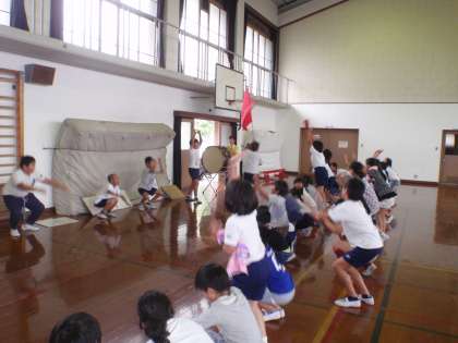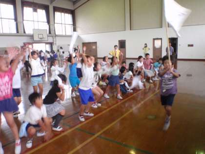 運動会の応援練習でしたが,昼休みは雨が降っていました。赤組も白組も体育館で練習しました。お互い刺激されたように大きな声が出ていました。
