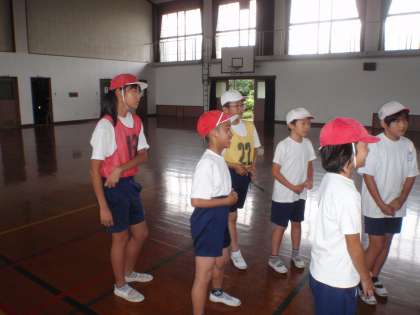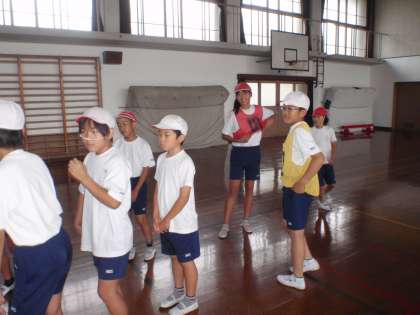 中間休みにリレーの練習をする予定でしたが,雨のために体育館に入りました。走る順番と並び方を確認しました。もちろん6年生がアンカーで走ります。