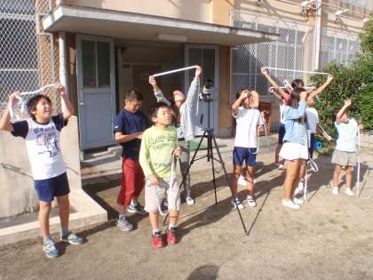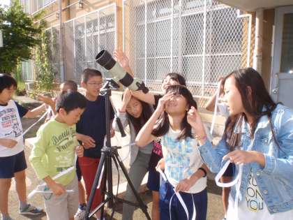 理科で「月と太陽」を学習しています。日中でも月が観測できました。月の見える形と太陽の位置との関係を調べました。