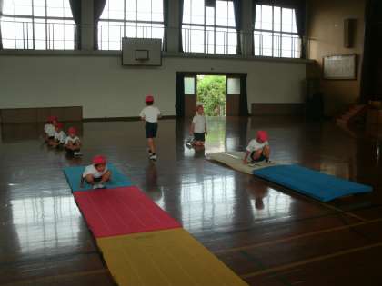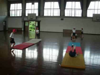 体育ではマットあそびに取り組んでいます。マットをつないで連続技に挑戦したり,踏切板を使って坂道にして練習したりしました。