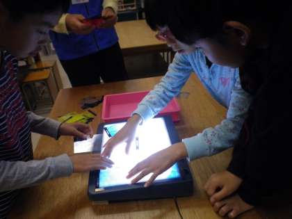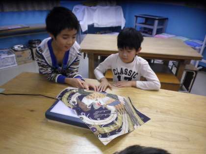 工房学習では,印刷技術について学習しました。4色のパズルを重ねると鮮やかな色になり,歓声を上げていました。