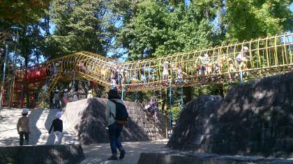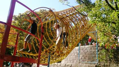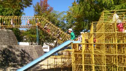 お弁当を食べ終わったあと,皇子が丘公園の遊園地の遊具で遊んでいます。