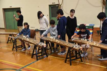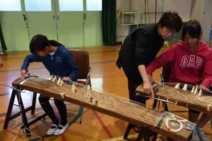 邦楽体験教室で,箏を演奏しました。初めての演奏でしたが,「さくらさくら」を演奏することができました。