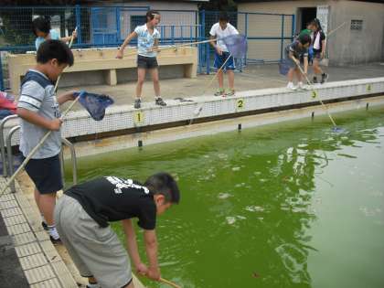 プールですいすい泳いでいるあめんぼ、ヤゴ、ゲンゴロウなど救い出しています。間もなくプールでの学習が始まりますので、彼らの住処を借りることになります。昨年は見事にトンボになって飛び立ちました。今年も隊員は張り切っています。