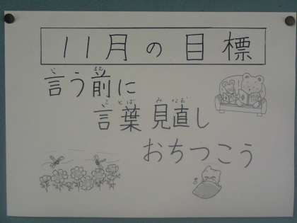 児童会から出された11月の生活目標は,「言う前に,言葉見直し,落ち着こう」です。友達とも落ち着いて,言葉を選んで丁寧に話をすると良いですね。