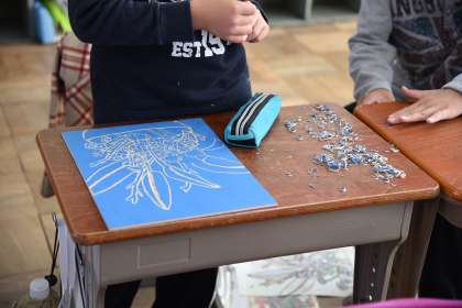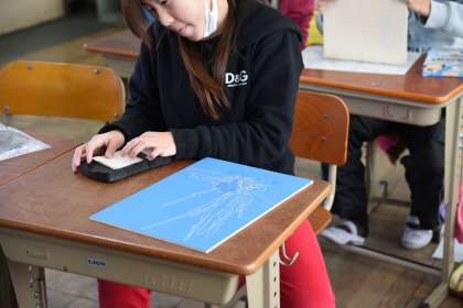 図画工作で版画を制作中です。多少刷りの版画です。線彫りができてきました。次の時間からは色を付けていきます。