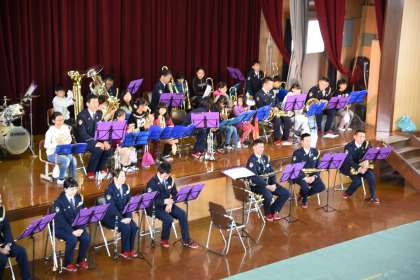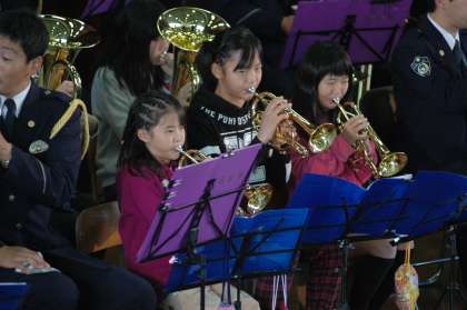 金管バンドクラブが「清掃と交通安全フェスティバル」の催しで,警察音楽隊といっしょに演奏しました。8名の6年生が活躍しました。人前で演奏するのは初めてでしたが,堂々とした演奏でした。