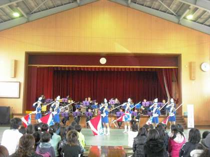 清掃のあと,体育館で伏見警察署交通課の方から「自転車に乗る時の交通ルール」について学びました。○×クイズに答えながら,楽しく学びました。そのあと京都府警察音楽隊とカラーガード隊による音楽を聴きました。校歌やビリーブなどを一緒に歌ったり,妖怪ウォッチの体操を踊ったりする曲目もあり,カラーガード隊の華やかな演出もあって,盛り上がりました。