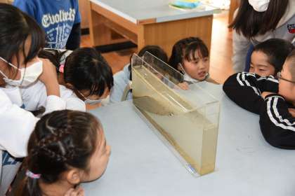 先週,理科の時間に実験用水槽を使って,地層のできるようすを学習しました。3日後に確認すると,濁りも消えてきれいな粘土層ができていました。地層ができるのに水が関係していることがよく分かりました。