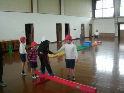 体育館で,「けんけんぱ」をしたり平均台に挑戦したりしました。