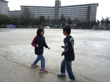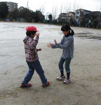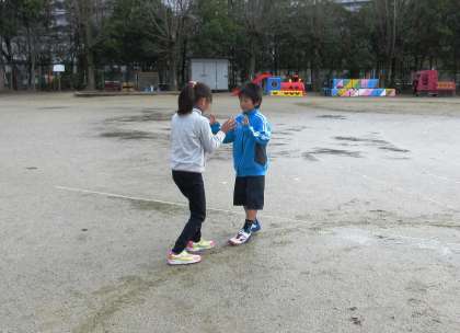 今日の全員あそびはサッカーの予定でしたが,運動場の中央に水たまりがあったので隅のほうでドンじゃんけんをして楽しんでいました。