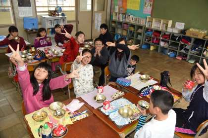 新しく来られた先生をお迎えして給食を食べました。賑やかな給食時間がさらに賑やかになりました。