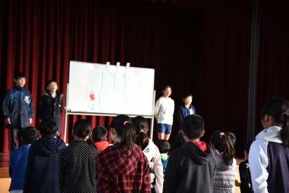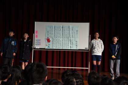 群読集会では,阪田寛夫作「年めぐり」を読みました。集会委員会の人達のリードで元気に群読しました。