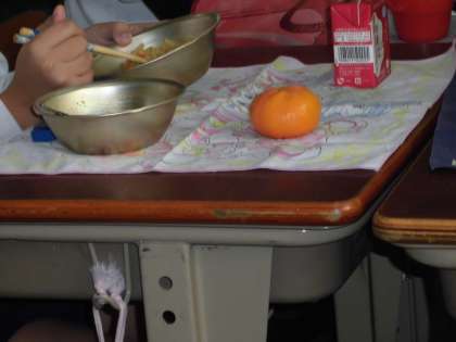 今日は防災用の米,ミカン,乾燥野菜を使った献立でした。牛乳,カレーピラフ,トマトスープ,ミカンでした。とってもおいしくきれいに食べきりました。