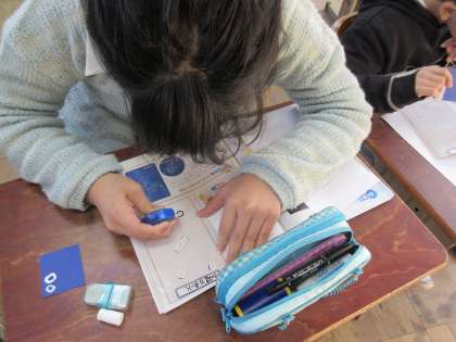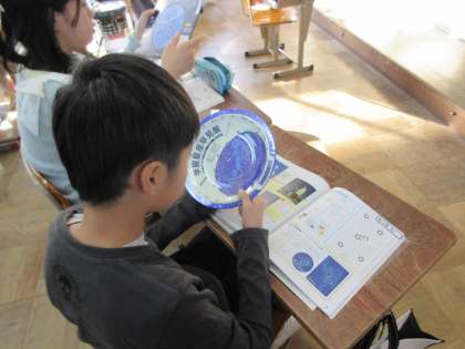 星の学習をしています。オリオン座シートをつくり,星座ばんで見える位置も確かめました。
